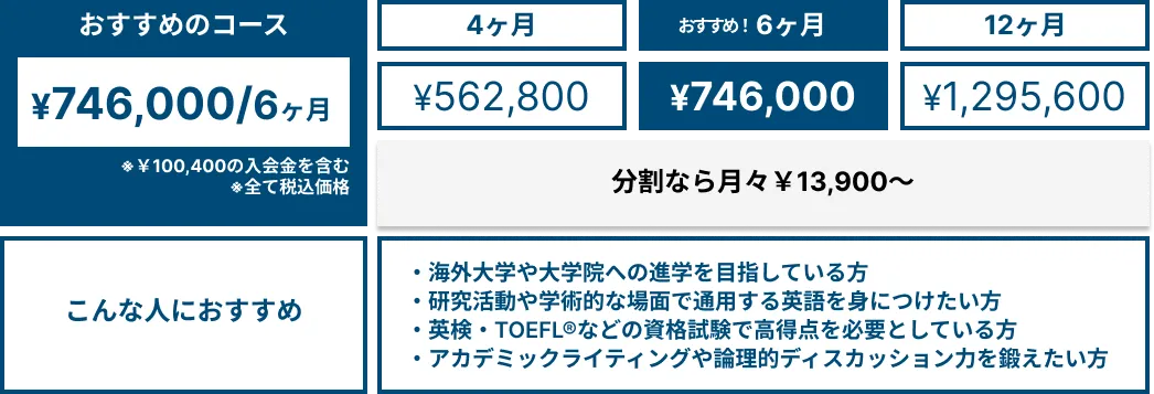 アカデミックコースは、海外大学への進学や資格取得を目指す方のために設計された、学術的スキルを重視した英語習得プログラムです。