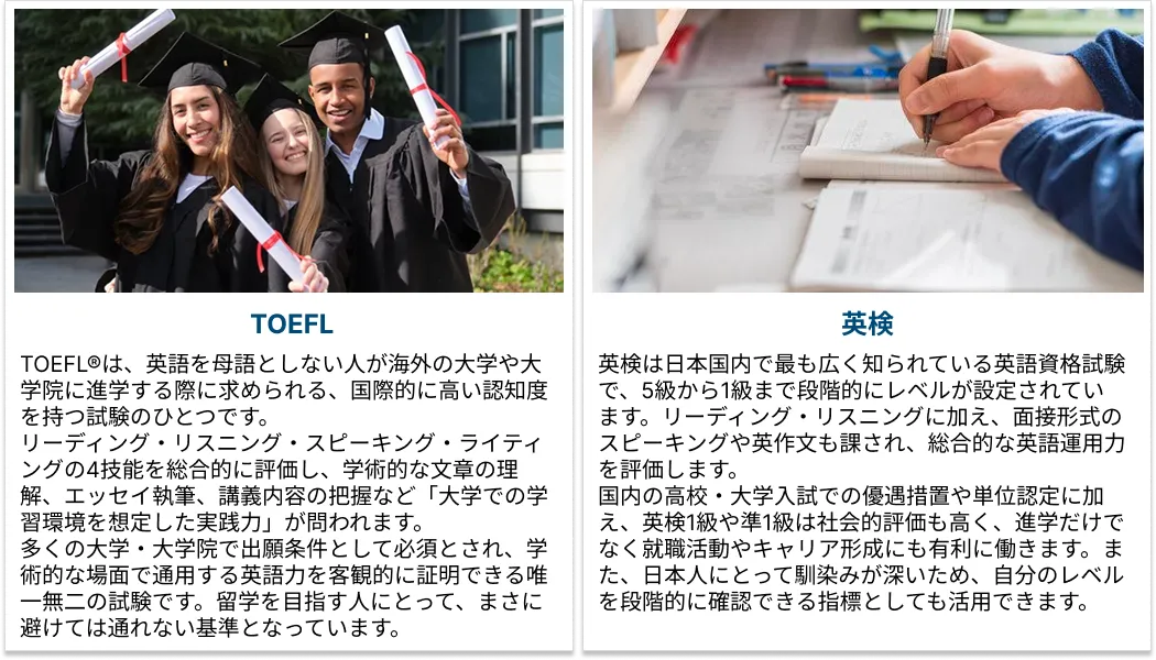 英検やTOEFL®などの試験対策に対応しながら、リーディング・リスニング・ライティング・スピーキングの4技能を総合的に鍛えます。