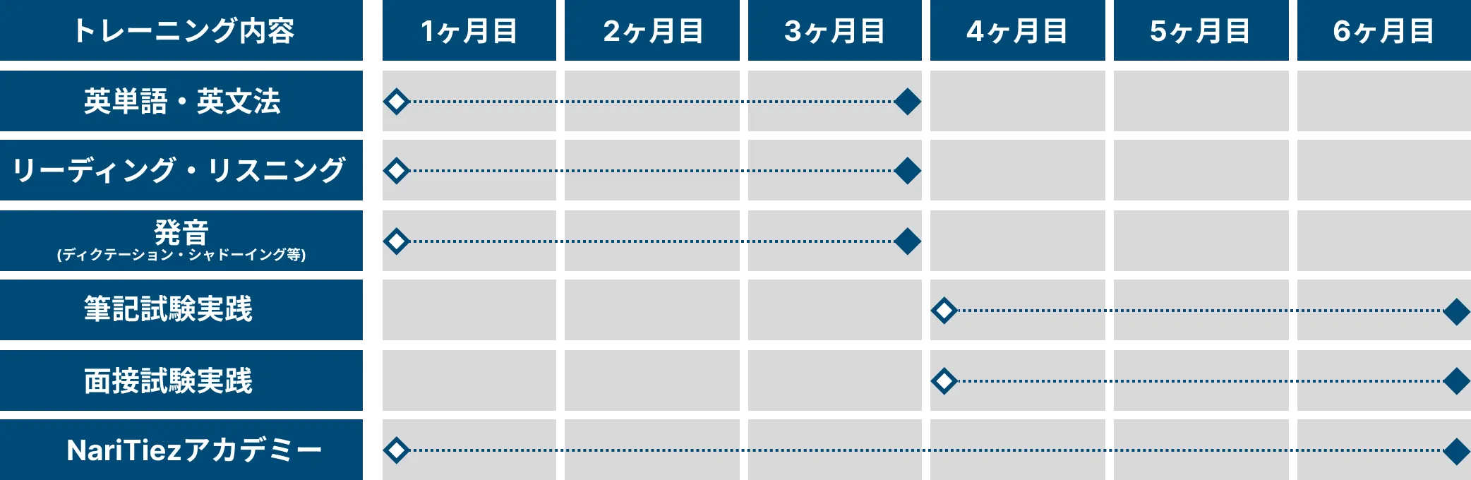 (実際のカリキュラムは、受講目的と受講前診断の結果に基づき、オーダーメイドで設計します)