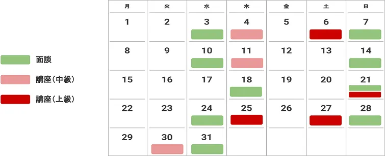 独自の予約システムから面談や講座の予約を行っていただきます。講座予約は週に1回以上が必須となっており、各講座に対して「受講希望度」を相対的に設定することで、希望度の高い講座の優先度が決定されます。授業日の2週間前から予約が可能で、授業の1週間前に予約が確定するシステムになっています。
