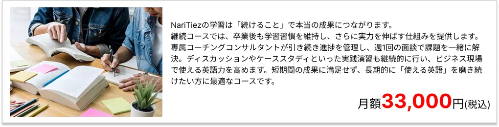 NariTiezでは、初級・中級・上級の段階別コースを設置。受講前のテストやヒアリングで習熟度を把握し、最適なレベルから学習を始めます。基礎強化から会話力育成、戦略プレゼンやケーススタディといった高度な実践まで、一人ひとりに合ったステップアップを実現します。