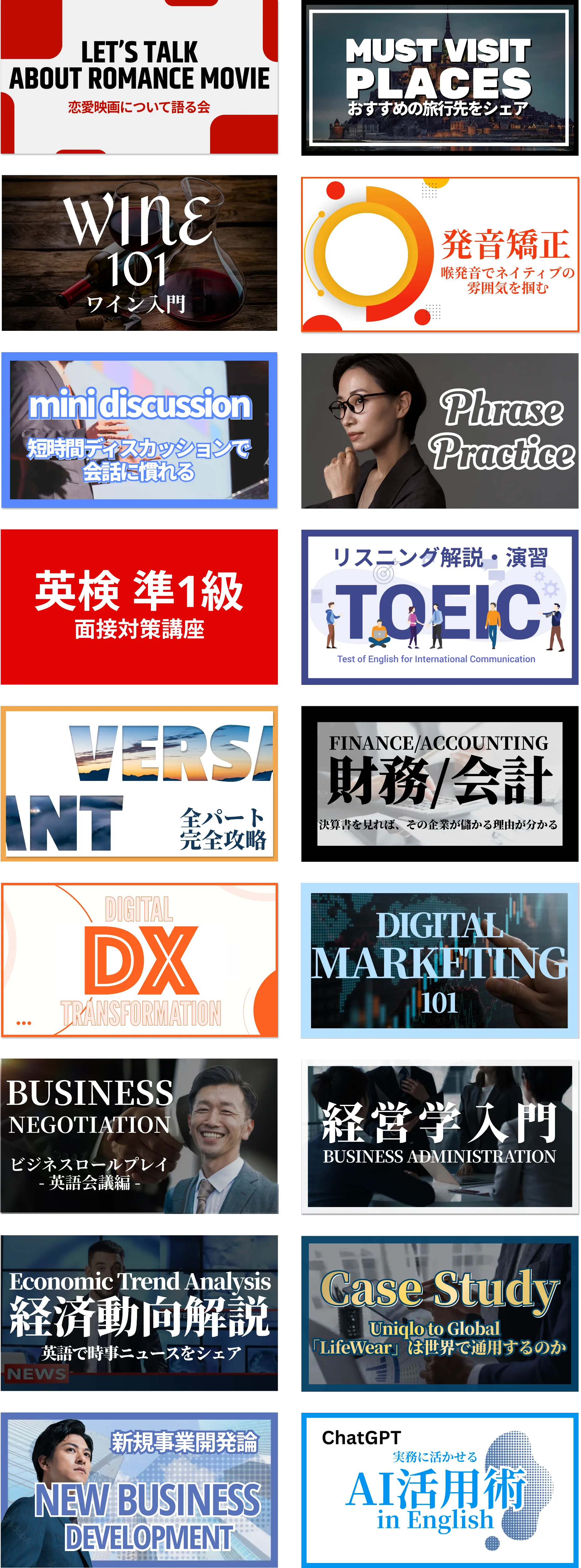 ライトなテーマから、ビジネスのケーススタディまで、全ての講座は実際の英会話で活用できる実践型の学習を重視しています。受講生が主体的に考え、話し、議論することで「使える英語」が自然に定着。実際の場面さながらの緊張感と面白さがあり、学習を楽しみながら継続できます。